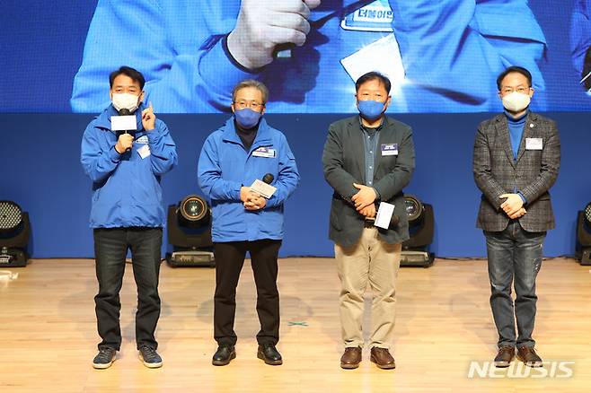 [원주=뉴시스] 김경목 기자 = 23일 오후 더불어민주당 강원 대전환 선거대책위원회 출범식이 강원도 원주시 원주문화원 문화공연장에서열리고 있다. 이광재(왼쪽부터)·송기헌·최윤·허영 공동상임선대위원장이 인사말을 하고 있다. 2022.01.23. photo31@newsis.com