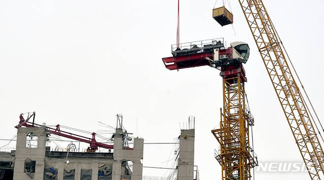 [광주=뉴시스] 류형근 기자 = 광주 서구 화정동 현대산업개발 신축 아파트 붕괴 사고 13일째인 23일 오후 타워 크레인 운전석에서 작업자들이 작업을 하고 있다. 2022.01.23. hgryu77@newsis.com