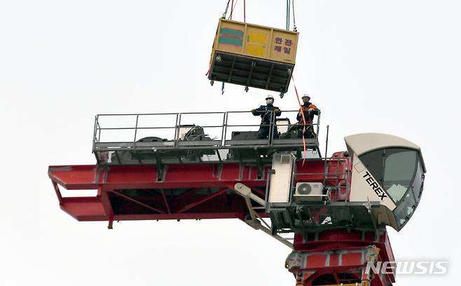 [광주=뉴시스] 류형근 기자 = 광주 서구 화정동 현대산업개발 신축 아파트 붕괴 사고 13일째인 23일 오후 타워 크레인 운전석에서 작업자들이 작업을 하고 있다. 2022.01.23. hgryu77@newsis.com