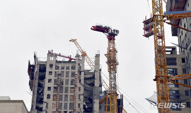 [광주=뉴시스] 류형근 기자 = 광주 서구 화정동 현대산업개발 신축 아파트 붕괴 사고 13일째인 23일 오후 타워 크레인 운전석 부근의 거푸집에 해체되고 있다. 2022.01.23. hgryu77@newsis.com
