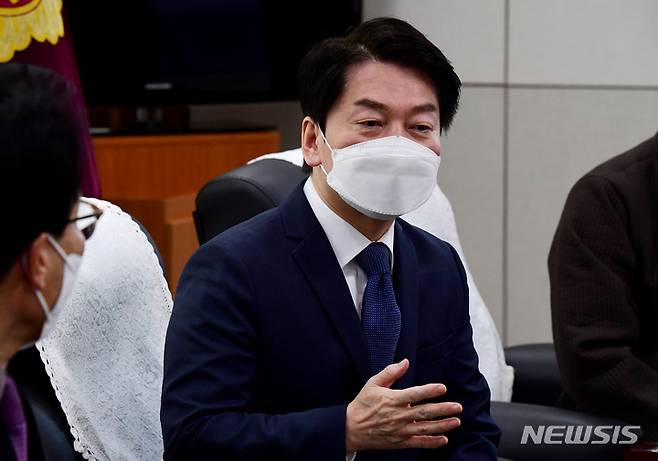 [창원=뉴시스] 차용현 기자 = 23일 오전 국민의당 안철수 대선후보가 경남 창원시 경남도의회를 찾아 의장단과 대화를 나누고 있다. 2022.01.23. con@newsis.com
