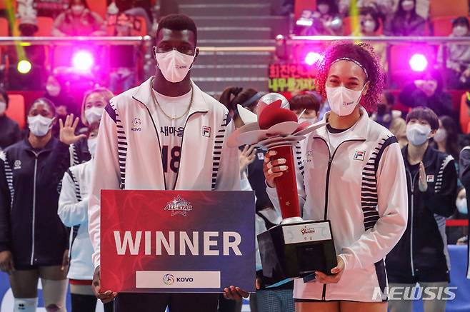 [광주=뉴시스] 권창회 기자 = 23일 오후 광주 서구 염주종합체육관에서 열린 '도드람 2021-2022 V리그 올스타전'에서 케이타, 엘리자벳이 우수팀 상을 받은 후 기념촬영을 하고 있다. 2022.01.23. kch0523@newsis.com