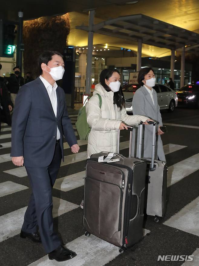 [인천공항=뉴시스] 국회사진기자단 = 안철수 국민의당 대선 후보와 부인 김미경 교수가 23일 오후 인천국제공항을 통해 귀국한 딸 안설희 박사를 마중하고 있다. 2022.01.23. photo@newsis.com