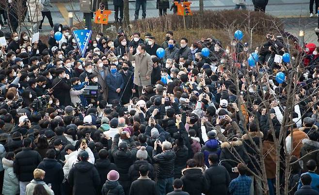 [서울=뉴시스] 김선웅 기자 = 이재명 더불어민주당 대선 후보가 23일 오후 경기 화성시 동탄중앙어울림센터 앞 광장에서 열린 '매타버스' 화성, 민심 속으로! 행사에서 화성 시민들에게 연설을 하고 있다. (사진=이재명 후보 캠프 제공) 2022.01.23. photo@newsis.com *재판매 및 DB 금지