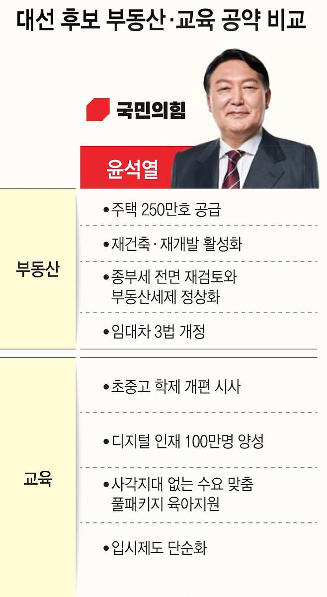 윤석열 국민의힘 대선 후보는 이재명 후보보다 앞서 광역급행철도(GTX) 연장 카드를 꺼내고 종합부동산세 등 세제 개편 의지를 강력하게 피력했다. 문재인 정부의 부동산 정책에 대한 반감을 등에 업고 부동산 공약을 쏟아냈다. 교육 분야에서는 세부적인 공약은 공개하지 않았지만 4차 산업혁명 대응을 위해 초중고 학제를 재편해야 한다고 밝힌 점이 주목을 받았다.