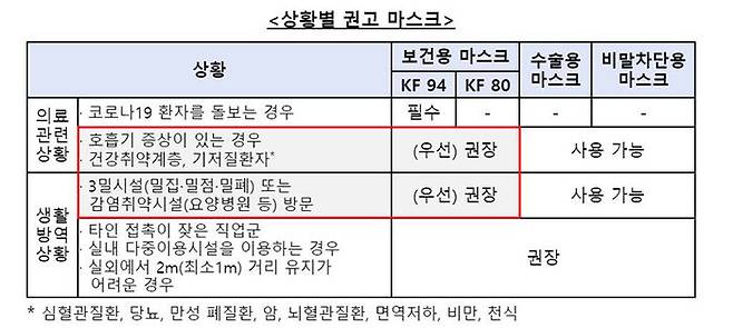 일상생활에서는 KF80 이상의 보건용 마스크 또는 수술용·비말 차단용 마스크 착용을 권장하지만, 3밀(밀집·밀접·밀폐) 시설이나 감염 취약시설을 방문하거나 심혈관질환 등 기저질환이 있는 땐 KF94 또는 KF80 마스크 착용을 우선 권고합니다.