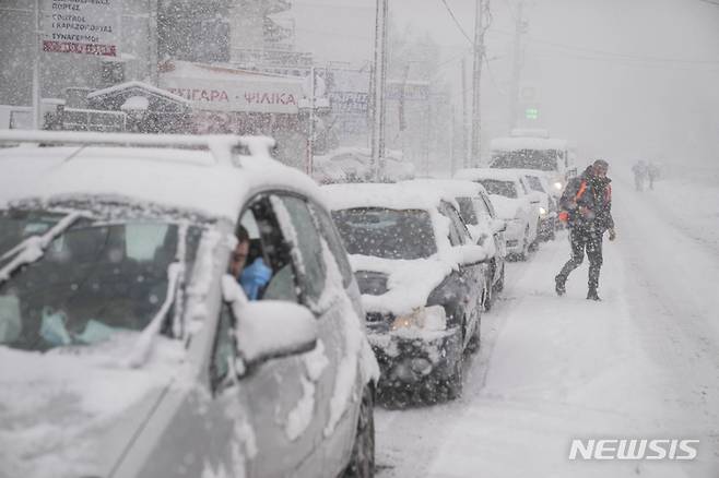 [아테네=AP/뉴시스] 24일(현지시간) 그리스 아테네 북쪽 아기오스 스테파노스에 눈이 내리는 동안 도로의 차량이 거북이 운행을 하고 있다. 악천후가 25일까지 계속될 것으로 예보되면서 당국은 시민들에게 불필요한 외출을 자제할 것을 촉구했다. 몇몇 주요 도로와 고속도로는 스노체인 장착 차량만 통행할 수 있다. 2022.01.24.