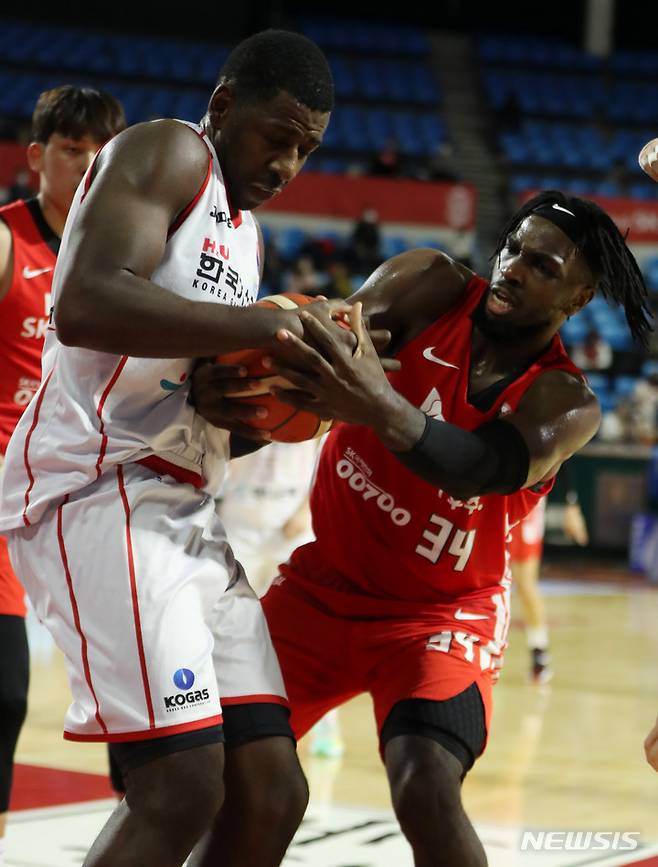 [서울=뉴시스] 추상철 기자 = 24일 오후 서울 송파구 잠실학생체육관에서 열린 '2021-2022 KGC 정관장 프로농구' 서울 SK 나이츠와 대구 한국가스공사 페가수스의 경기, SK 워니와 한국가스공사 니콜슨이 리바운드 다툼을 하고 있다. 2022.01.24. scchoo@newsis.com