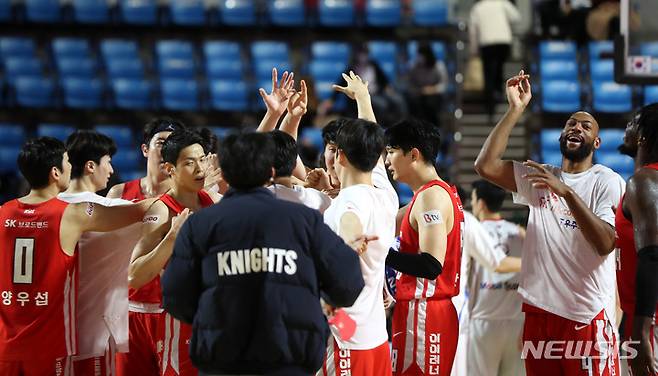 [서울=뉴시스] 추상철 기자 = 24일 오후 서울 송파구 잠실학생체육관에서 열린 '2021-2022 KGC 정관장 프로농구' 서울 SK 나이츠와 대구 한국가스공사 페가수스의 경기, 97대 85로 승리를 거둔 SK 선수들이 기뻐하고 있다. 2022.01.24. scchoo@newsis.com