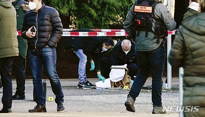 [하이델베르크=AP/뉴시스] 경찰관들이 24일(현지시간) 독일 남서부 하이델베르크에 있는 하이델베르크 대학 구내에서 범죄 증거물들을 수집하고 있다. 이날 하이델베르크 대학에서 괴한이 강의실에서 총격을 가해 4명이 부상했다. 2022.01.25