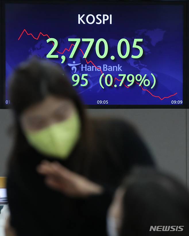 [서울=뉴시스] 조수정 기자 = 코스피가 전 거래일(2790.00)보다 5.59포인트(0.20%) 내린 2786.41에 출발한 25일 오전 서울 중구 하나은행 딜링룸에서 전광판의 지수가 2770.05로 표시되고 있다. 코스닥은 전 거래일(915.40)보다 5.55포인트(0.61%) 오른 920.95에, 서울 외환시장에서 원·달러 환율은 전 거래일(1196.1)보다 0.1원 내린 1196.0원에 개장했다. 2022.01.25. chocrystal@newsis.com