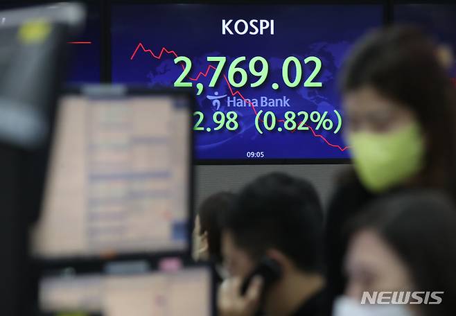 [서울=뉴시스] 조수정 기자 = 코스피가 전 거래일(2790.00)보다 5.59포인트(0.20%) 내린 2786.41에 출발한 25일 오전 서울 중구 하나은행 딜링룸에서 전광판의 지수가 2769.02로 표시되고 있다. 코스닥은 전 거래일(915.40)보다 5.55포인트(0.61%) 오른 920.95에, 서울 외환시장에서 원·달러 환율은 전 거래일(1196.1)보다 0.1원 내린 1196.0원에 개장했다. 2022.01.25. chocrystal@newsis.com
