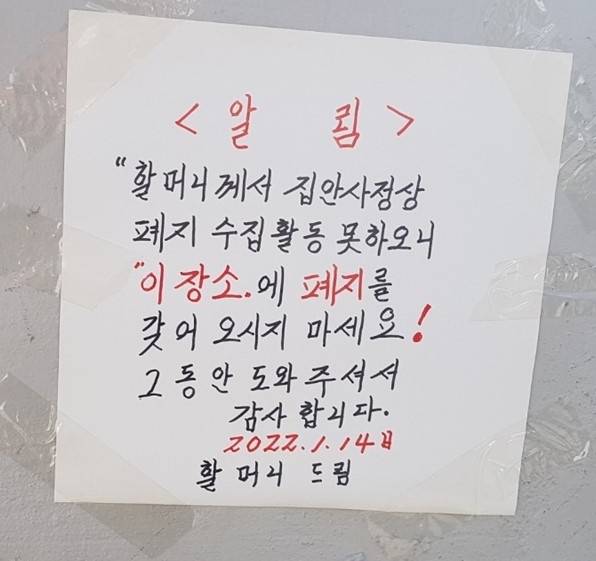 며칠 전 할머니께 폐지를 드리려고 할머니 집을 찾았다. 두 손에는 언제나처럼 박스가 여러 개 들려 있는 상태였다. 그런데 할머니의 집의 풍경이 여느 날과는 많이 달랐다. 박스를 정리하고 계실 할머니의 모습 대신에 이상한 대자보가 붙어있었다.