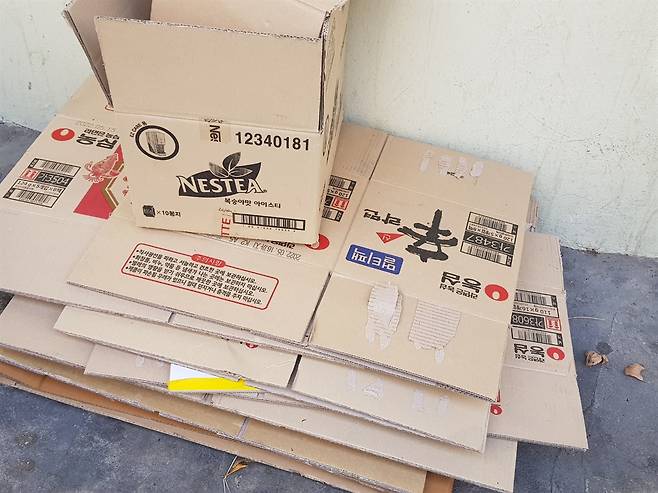 | ▲ 박스 할머님께 드리려고 모아 놓은 박스들이다. 대부분 택배로 받은 박스들이다. 할머니를 드리려고 주워온 박스도 있다. |