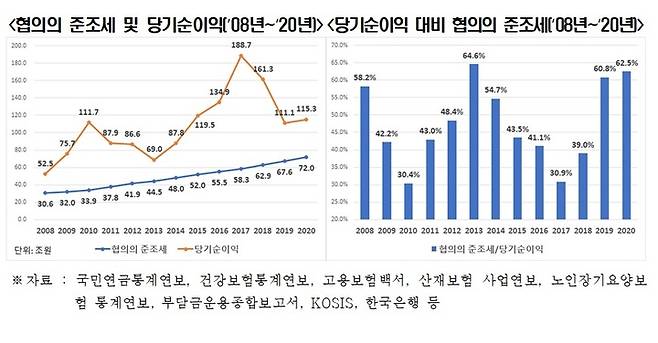 그 결과 '당기순이익 대비 협의의 준조세 비중'은 ▲2017년 30.9% ▲2018년 39.0% ▲2019년 60.8% ▲2020년 62.5%로 최근 들어 급증하는 모습을 보이고 있다.