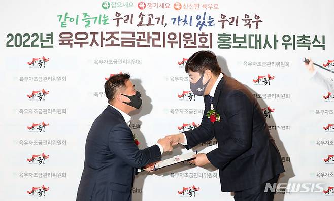 [서울=뉴시스] 이영환 기자 = 박대안(왼쪽) 육우자조금관리위원회 위원장이 25일 오전 서울 서초구 엘타워에서 열린 육우자조금관리위원회 홍보대사 위촉식에 참석해 양준혁 홍보대사에게 위촉장을 전달 하고 있다. 2022.01.25. 20hwan@newsis.com