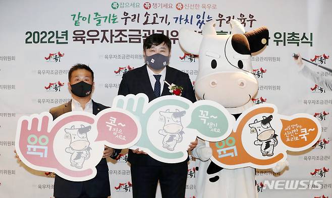 [서울=뉴시스] 이영환 기자 = 박대안(왼쪽부터) 육우자조금관리위원회 위원장과 양준혁 육우자조금관리위원회 홍보대사가 25일 오전 서울 서초구 엘타워에서 열린 홍보대사 위촉식에 참석해 기념촬영을 하고 있다. 2022.01.25. 20hwan@newsis.com