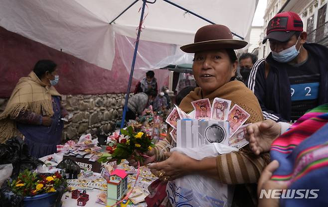 [라파스=AP/뉴시스] 24일(현지시간) 볼리비아 라파스에서 연례 알라시타 축제가 열려 한 여성이 미니 물품과 모조 화폐를 사서 들고 있다. 매년 1월 열리는 이 축제에서 사람들은 1년 동안 얻기를 열망하는 집, 자동차 등의 작은 복제품을 사면서 소망이 이뤄지길 기원한다. 2022.01.25.