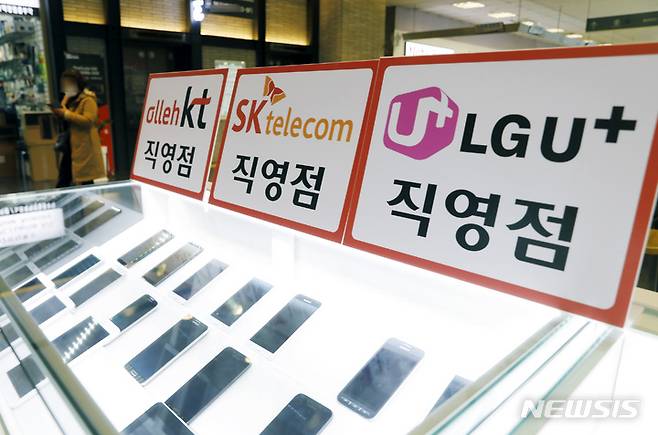 이동통신 3사의 영업이익 합계가 작년에 사상 처음으로 4조원을 넘어서며 역대 최대치를 기록할 것으로 전망되고 있는 25일 서울의 한 이동통신 대리점에 통신 3사 홍보물이 걸려 있다.