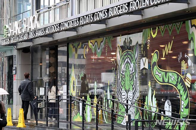 [서울=뉴시스] 백동현 기자 = 햄버거 프랜차이즈 쉐이크쉑이 버거와 음료 등 10여종 제품의 가격을 인상한 25일 오후 서울 강남구 쉐이크쉑 강남점에서 고객들이 매장으로 들어가고 있다. 2022.01.25. livertrent@newsis.com