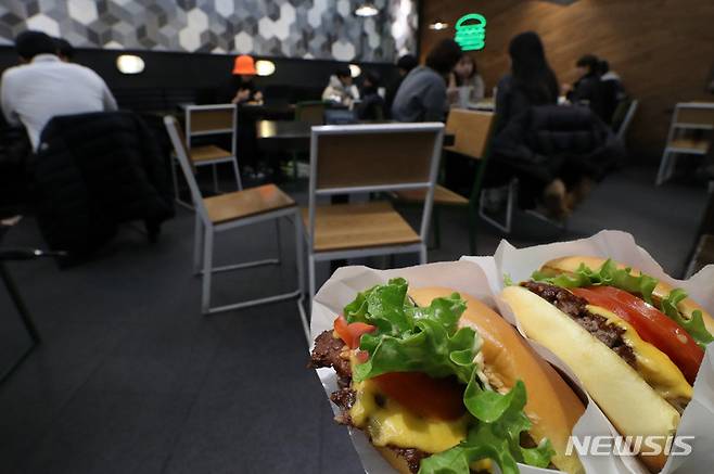 [서울=뉴시스] 백동현 기자 = 햄버거 프랜차이즈 쉐이크쉑이 버거와 음료 등 10여종 제품의 가격을 인상한 25일 오후 서울 강남구 쉐이크쉑 강남점에서 고객들이 매장에서 식사하고 있다. 2022.01.25. livertrent@newsis.com