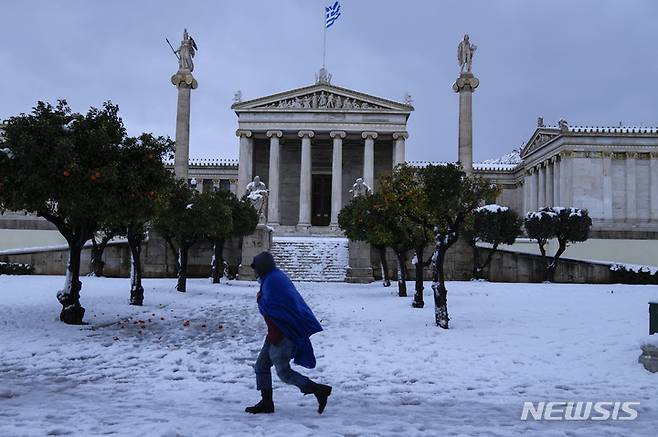 [아테네=AP/뉴시스] 25일(현지시간) 그리스 아테네에서 담요를 둘러쓴 한 노숙인이 아테네 학술원 앞 눈 쌓인 광장을 걷고 있다. 그리스 수도 아테네와 터키 이스탄불에 내린 폭설로 도로와 항공 교통이 마비됐다. 당국은 눈 예보가 이어지면서 시민들에게 불필요한 외출 자제를 당부했다. 2022.01.25.