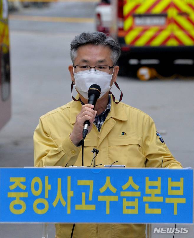 [광주=뉴시스] 변재훈 기자 = 중앙사고수습본부 소속 진명기 행정안전부 재난복구정책관이 24일 오후 광주 서구 HDC현대산업개발 신축 아파트 붕괴 사고 현장에서 실종자 수색·구조 경과에 대해 설명하고 있다. 붕괴 사고 15일째인 이날 현재까지 여전히 공사 근로자 5명이 실종된 상태다. 2022.01.25. wisdom21@newsis.com