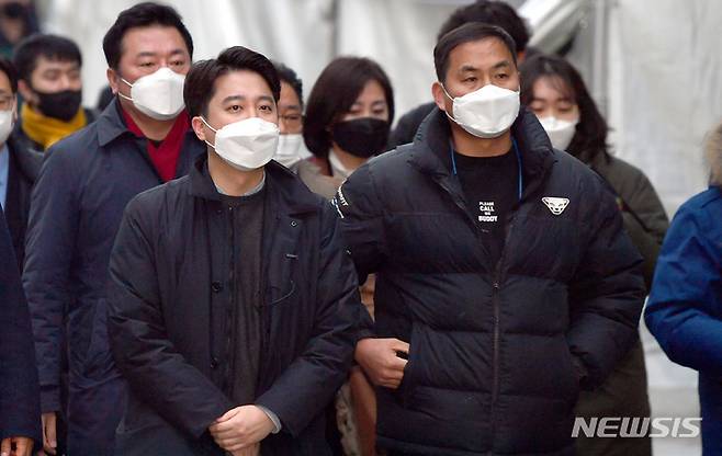 [광주=뉴시스] 류형근 기자 = 광주 서구 화정동 현대산업개발 신축 아파트 붕괴 사고 15일째인 25일 오후 국민의힘 이준석 대표와 붕괴피해자가족협의회 대표가 사고현장을 방문하고 있다. 2022.01.25. hgryu77@newsis.com