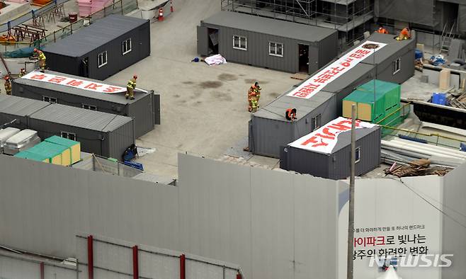 [광주=뉴시스] 류형근 기자 = 광주 서구 화정동 현대산업개발 신축 아파트 붕괴 사고 15일째인 25일 오후 사고현장 인근의 컨테이너에 중앙119구조본부 현수막이 설치되고 있다. 2022.01.25. hgryu77@newsis.com