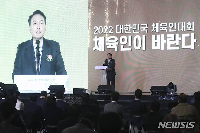 [서울=뉴시스] 국회사진기자단 = 윤석열 국민의힘 대선 후보가 25일 서울 송파구 올림픽공원 SK핸드볼경기장에서 열린 2022 대한민국체육인대회에 참석해 축사하고 있다. 2022.01.25. photo@newsis.com