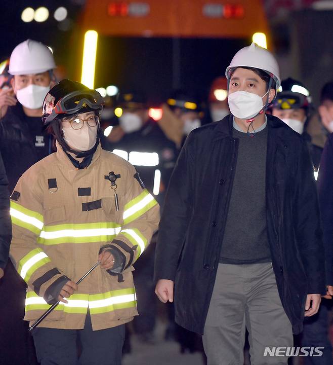 [광주=뉴시스] 류형근 기자 = 광주 서구 화정동 현대산업개발 신축 아파트 붕괴 사고 15일째인 25일 오후 국민의힘 이준석 대표가 붕괴피해자가족협의회와 사고현장을 방문한 뒤 돌아오고 있다. 2022.01.25. hgryu77@newsis.com