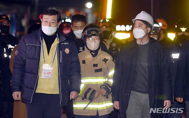 [광주=뉴시스] 류형근 기자 = 광주 서구 화정동 현대산업개발 신축 아파트 붕괴 사고 15일째인 25일 오후 국민의힘 이준석 대표가 붕괴피해자가족협의회와 사고현장을 방문한 뒤 돌아오고 있다. 2022.01.25. hgryu77@newsis.com