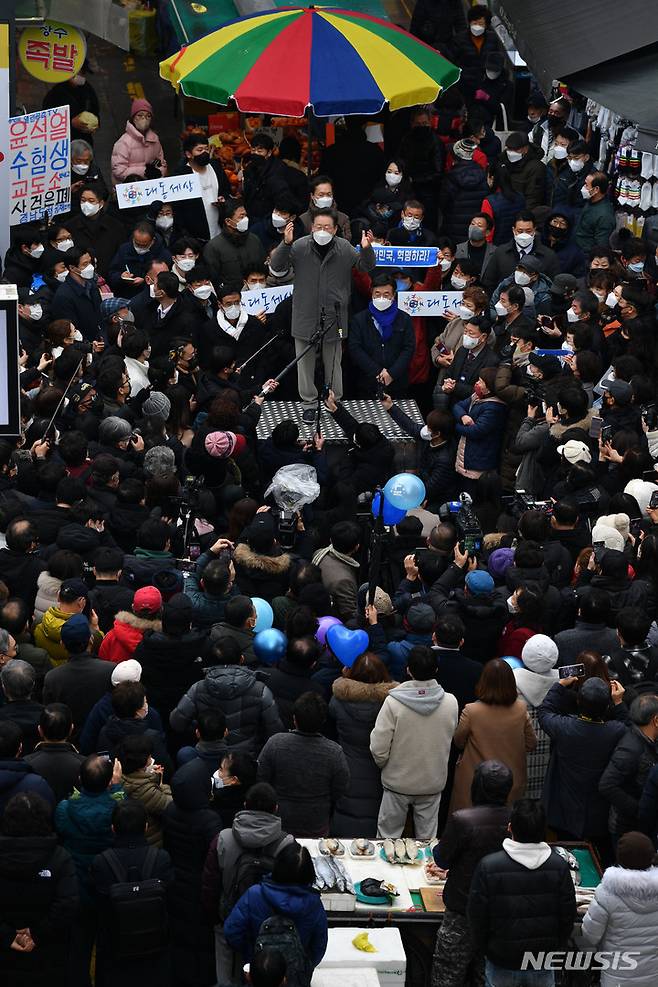 [구리=뉴시스] 국회사진기자단 = 이재명 더불어민주당 대선 후보가 25일 경기 구리전통시장을 방문해 지지를 호소하고 있다. 2022.01.25. photo@newsis.com
