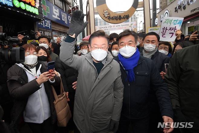 [구리=뉴시스] 국회사진기자단 = 이재명 더불어민주당 대선 후보가 25일 경기 구리전통시장을 방문해 윤호중 원내대표와 시민들과 인사하고 있다. 2022.01.25. photo@newsis.com