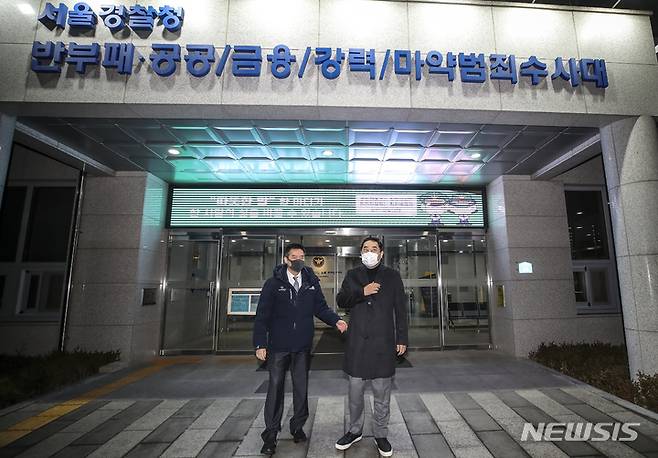 [서울=뉴시스] 정병혁 기자 = 이준석 국민의힘 대표가 과거 벤처기업 대표로부터 성 접대를 받았다는 의혹을 제기한 유튜브 채널 가로세로연구소(가세연)의 강용석 변호사와 김세의 전 MBC기자가 25일 오후 서울 마포구 서울경찰청 반부패·공공범죄수사대에서 고발인 조사를 마친 뒤 나오고 있다. 2022.01.25 jhope@newsis.com