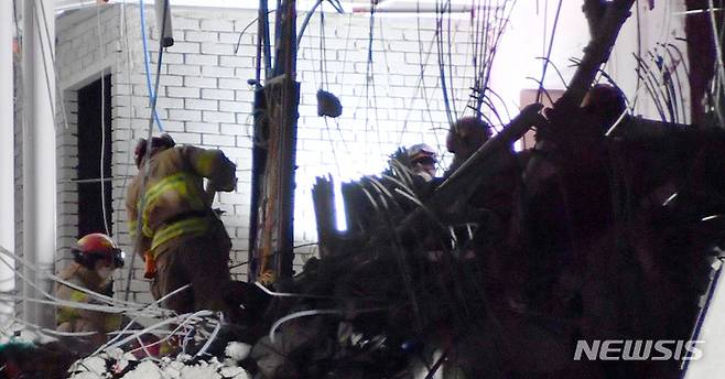[광주=뉴시스] 류형근 기자 = 광주 서구 화정동 현대산업개발 신축 아파트 붕괴 사고 15일째인 25일 오후 구조당국 등이 고층에서 야간 실종자 수색작업을 하고 있다. 2022.01.25. hgryu77@newsis.com