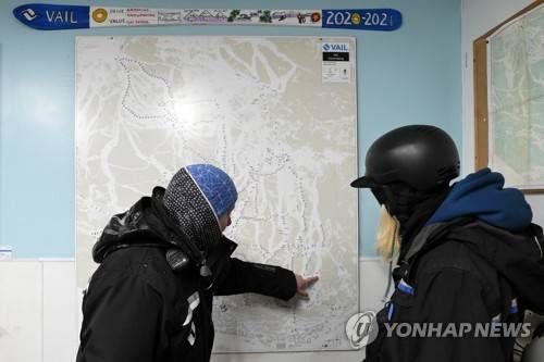 CORRECTS LAST NAME TO SCHIFANI FROM SHIFANI - Snowmakers Kate Schifani, left, and Ryan Schultz review a snowmaking map at Vail Mountain, Wednesday, Dec. 29, 2021, in Vail, Colo. Newer snowmaking technology is allowing ski areas to be more efficient with energy and water usage as climate change continues to threaten snowpack levels. (AP Photo/Brittany Peterson).