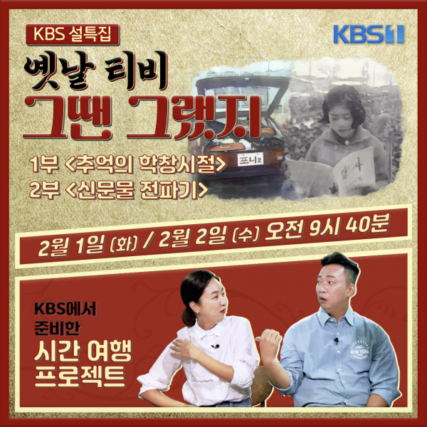 내 인생의 첫 사회생활, 학교에 가던 날의 추억, 운동장 풍경, 특별한 날의 진풍경을 아카이브 자료로 만난다. '학교 다녀오겠습니다 추억의 학창 시절' 은 2월 1일 오전 9시 40분에 경부고속도로 개통, 지하철 개통, 시대별 변화를 만나는 '모든 것이 놀라웠다! 新문물 열전'은 2월 2일 오전 9시 40분에 각각 방송된다.