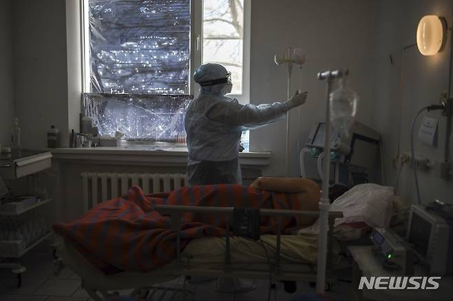 [모스크바=AP/뉴시스] 25일(현지시간) 러시아 남부 크라스노다르주 폴타프스카야 마을의 한 병원에서 의료진이 코로나19 환자를 치료하고 있다. 러시아 당국은 지난 2주 동안 코로나19 일일 확진자가 4배 이상 급증했다고 밝혔다. 2022.01.26.