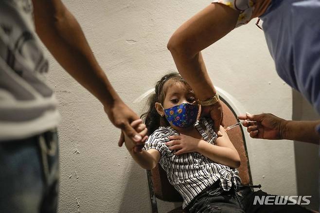 [카라카스=AP/뉴시스] 25일(현지시간) 베네수엘라 카라카스의 한 호텔 내에 설치된 코로나19 백신 접종소에서 한 소녀가 시노팜 백신을 접종하고 있다. 2022.01.26.