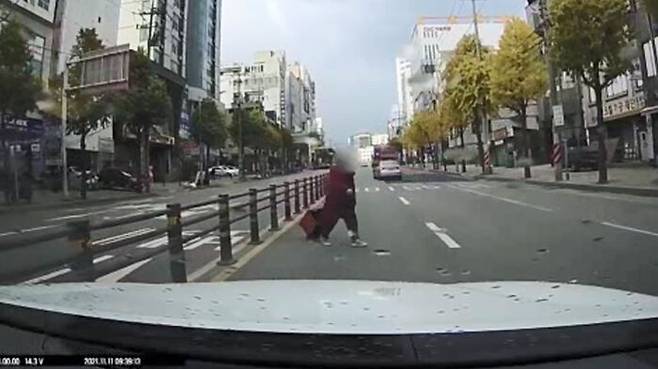 지난해 11월에도 비슷한 모습이 포착된 적이 있는데요, 인천의 교차로에서 한 할머니가 마찬가지로 중앙분리대 아래로 기어 무단 횡단하는 아찔한 순간이었습니다.