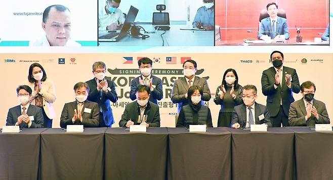 [서울=뉴시스] 정병혁 기자 = 황수성 산업통상자원부 산업혁신성장실장을 비롯한 참석자들이 26일 서울 강남구 조선팰리스호텔에서 열린 한-아세안 시장진출 R&D 업무협약식에서 기념촬영을 하고 있다. (사진=산업통상자원부 제공) 2022.01.26. photo@newsis.com *재판매 및 DB 금지