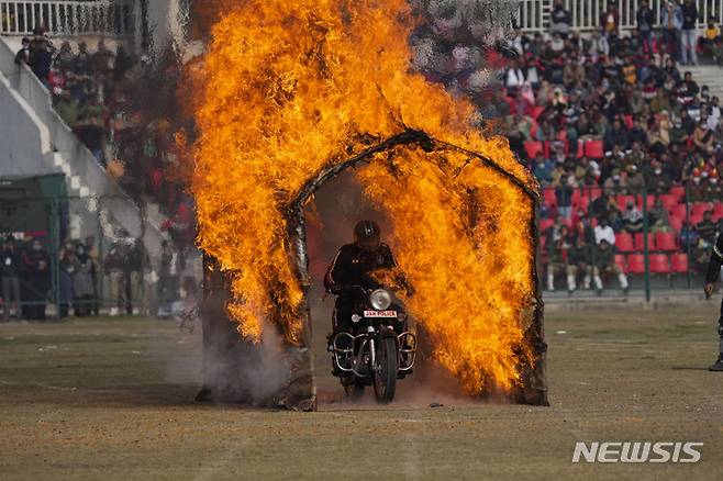 [잠무=AP/뉴시스] 인도 공화국의 날인 26일(현지시간) 인도 잠무에서 잠무-카슈미르주 경찰이 오토바이 묘기를 선보이고 있다. 인도는 1950년 1월 26일 헌법을 채택하고 공화국을 선포했다. 2022.01.26.