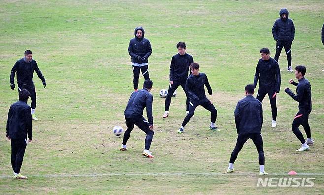 [시돈(레바논)=뉴시스] 배훈식 기자 = 대한민국 축구 국가대표팀 선수들이 26일 오후 레바논 시돈 사이다 무니시팔 경기장에서 2022 카타르 월드컵 아시아 지역 최종예선 레바논과의 경기를 하루 앞두고 비를 맞으며 훈련하고 있다. 2022.01.26. dahora83@newsis.com