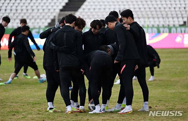 [시돈(레바논)=뉴시스] 배훈식 기자 = 대한민국 축구 국가대표팀 선수들이 26일 오후 레바논 시돈 사이다 무니시팔 경기장에서 2022 카타르 월드컵 아시아 지역 최종예선 레바논과의 경기를 하루 앞두고 훈련하고 있다. 2022.01.26. dahora83@newsis.com
