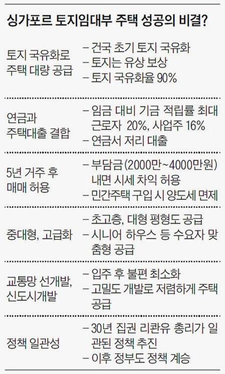 건국 초기부터 토지 국유화를 추진했다. 강제 몰수가 아니라 보상에 의한 토지 수용으로, 현재 토지 국유화율이 90%에 달한다. 주택 건설 비용은 연금과 주택담보대출의 결합으로 돌파구를 찾았다. 당초 중앙후생기금(Central Provident Fund, CPF)은 한국의 국민연금과 마찬가지로 노후 보장이 주 목적이었다. 그러나 1968년 공공 주택에 CPF 적립금을 사용할 수 있도록 법을 바꿨다. 공공 주택을 분양받으면 CPF 기금을 통해 1차 조달하고, 모자라면 주택개발청(HDB)에서 융자를 받는다. 임금 대비 기금 적립률이 근로자 임금의 최고 20%, 사업주는 16%까지 내야 한다. 노후와 집 마련을 위한 일종의 강제 저축이다. 원리금은 장기 상환하는데 실질 금리가 1%대로 저소득층은 집값의 최대 40%까지 정부가 지원한다.