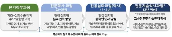마이스터대는 고숙련 전문기술인재 육성을 위해 단기-전문학사-전공심화과정(학사)-전문기술석사과정의 교육 과정을 편성해 운영하는 대학이다.