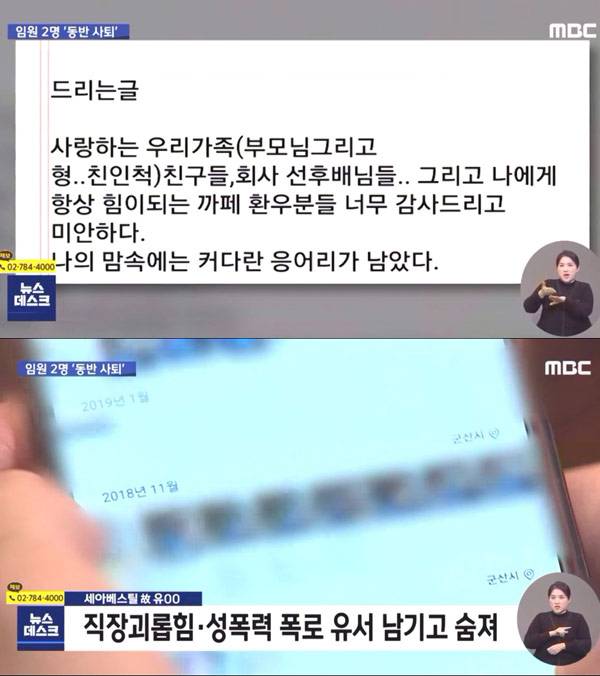 유 씨의 사연이 보도된 바로 다음 날인 지난 1월 25일 세아베스틸은 대표이사 명의의 입장문을 내고 사과했습니다. 군산공장 박준두 대표이사와 제강담당 김기현 이사가 사퇴했습니다. 박 대표이사는 유 씨가 숨질 당시 인사관리 총괄 책임자였습니다. 김 이사는 당시 유 씨가 일하던 부서의 팀장이었습니다. 김 이사에 대해 당시 노무법인은 '성추행과 부적절한 언행을 인지하고도 방관했다'며 직위해제 하라고 했지만, 3년 전 회사는 그냥 넘어갔었습니다. 그러다 언론 보도로 문제가 되자 뒤늦게 책임을 지게 한 겁니다.