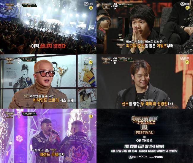 '쇼미더머니10'을 빛낸 정상급 래퍼들의 축제 '쇼미더머니10 Festival X ON THE K'는 오는 1월 28일 오후 11시에 Mnet에서 방송되며, 27일에는 KOCCA MUSIC 유튜브 및 트위터 채널을 통해 선공개된다.