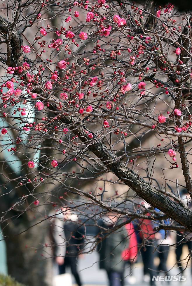 [부산=뉴시스] 하경민 기자 = 절기상 입춘을 1주일여 앞둔 27일 부산 남구 유엔기념공원에서 활짝 핀 홍매화가 봄기운을 전하고 있다. 2022.01.27. yulnetphoto@newsis.com